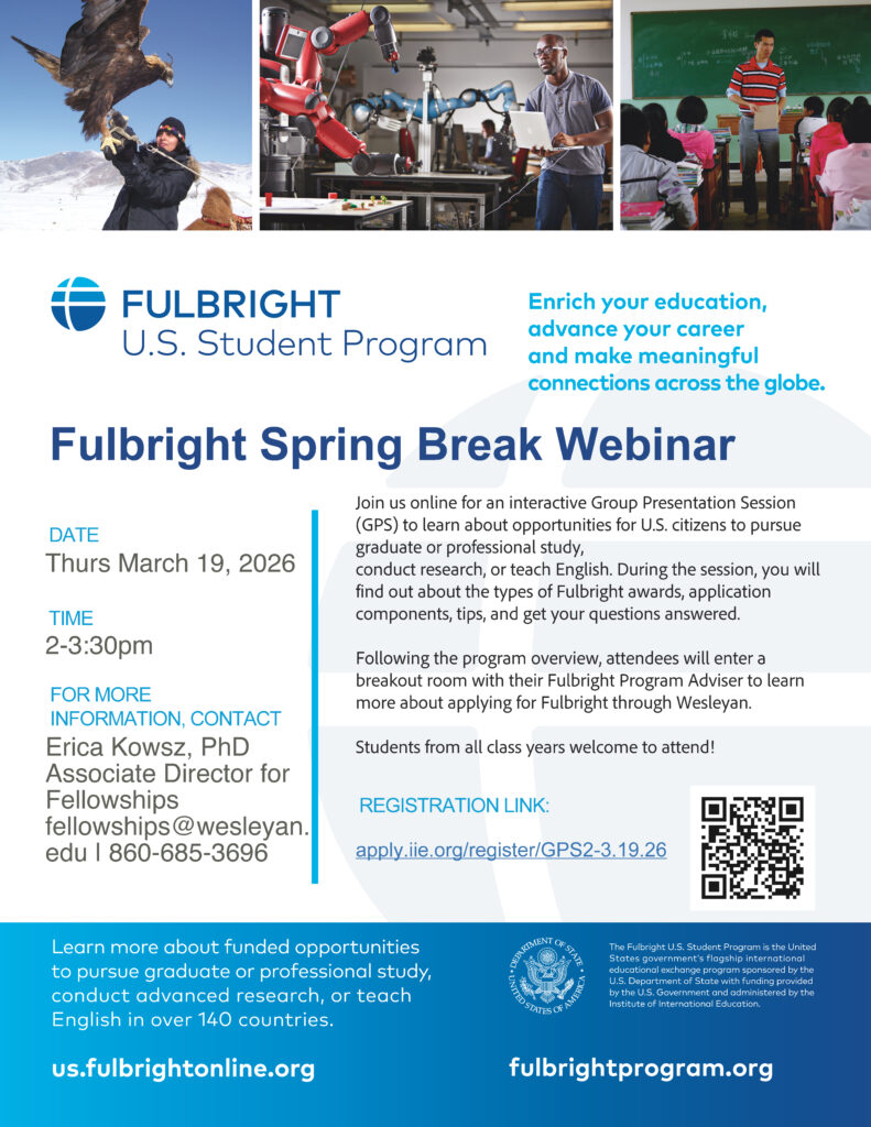 On Thursday, March 19 at 2-3:30pm, Wesleyan will participate in a national virtual information session on the Fulbright U.S. Student Program and alumni ambassadors. The webinar will walk students through the fundamentals of Fulbright first, followed by a Wesleyan-specific breakout session hosted by Dr. Erica Kowsz, Associate Director of Fellowships at the Fries Center for Global Studies.
